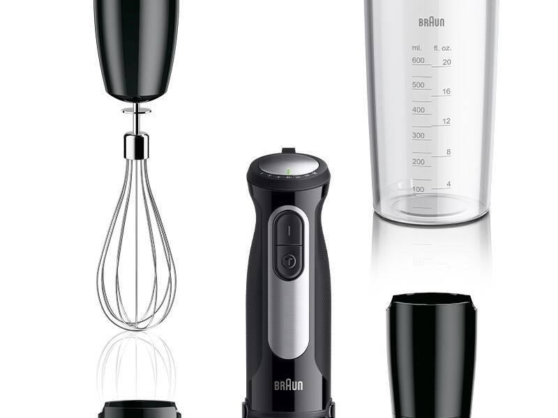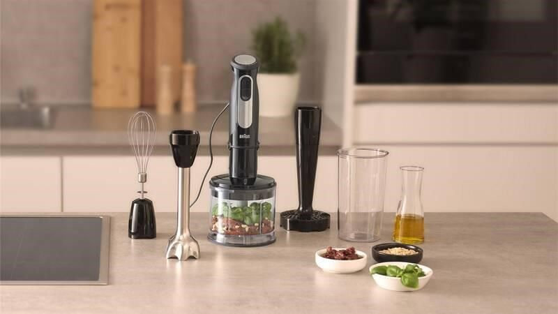 Ponorný mixér Braun MQ55.307M MultiQuick 5 Pro se stane vaším nepostradatelným pomocníkem v kuchyni. Potěší svým špičkovým výkonem, který dosahuje 1 000 W. Vybrat si můžete z 25 rychlostí a režimu Turbo, který z přístroje během okamžiku vytěží maximum. Manipulaci s přístrojem usnadňuje přítomnost ergonomické rukojeti. Samozřejmostí je velmi jednoduché ovládání, které si snadno osvojíte. Výměnu jednotlivých nástavců a příslušenství zjednodušuje systém EasyClick Plus.