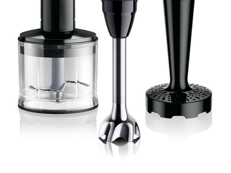 Ponorný mixér, výkon 1 000 W, 25 rychlostí + Turbo, technologie PowerBell Vplus pro jemné výsledky mixování, systém EasyClick Plus, technologie SplashControl proti rozstřiku surovin, ergonomická rukojeť, nástavec pro přípravu pyré, sekací nástavec s nádobou o objemu 500 ml, nerezová šlehací metla, 600ml plastová mixovací nádoba.... více