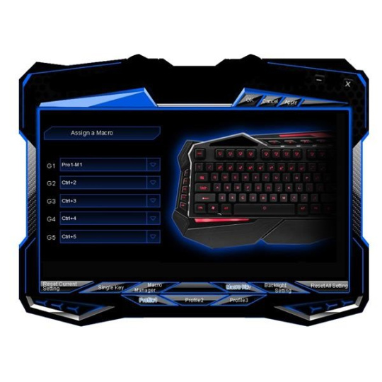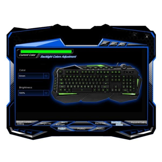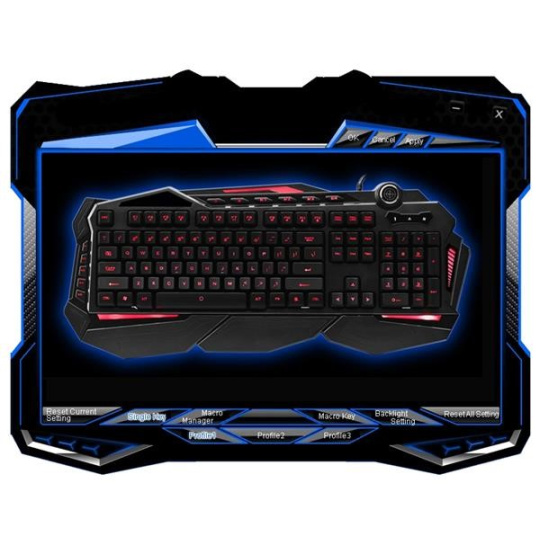 3 profily - na klávesnici naleznete klávesy pro přepínání mezi 3 nezávislými profily. Pro každý profil lze individuelně nastavit barva podsvícení, její intenzita, makra, předefinované klávesy...