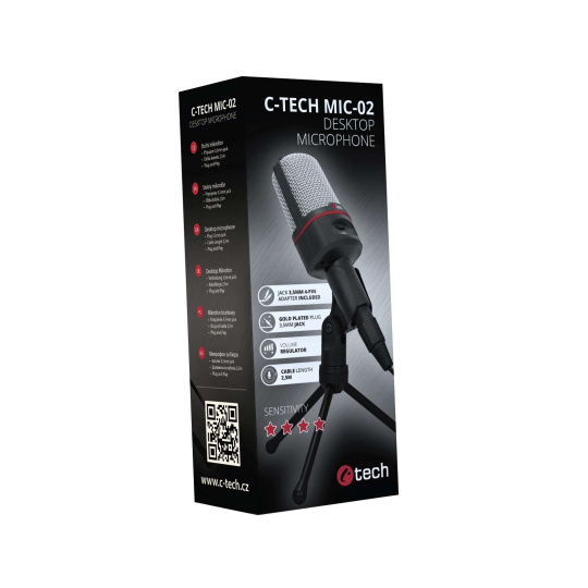 C-TECH MIC-02 je vysoce kvalitní mikrofon s přirozenou kvalitou reprodukce hlasu pro každodenní použití. Své uplatnění najde jak při použití s komunikačními programy, tak i při vytváření youtube videí nebo live přenosů. Mikrofon se připojuje pomocí 2,5m kabelu s pozlaceným stereo konektorem jack 3,5mm, v balení však naleznete i redukci jack stereo 3-pin/4-pin pro připojení mikrofonu k zařízení, které je vybaveno sloučeným audio konektorem pro mikrofon a sluchátka. Mikrofon je vybaven zapínacím tlačítkem s regulací hlasitosti. V balení naleznete praktický podstavec (tripod), díky kterému lze umístit mikrofon do různých poloh.