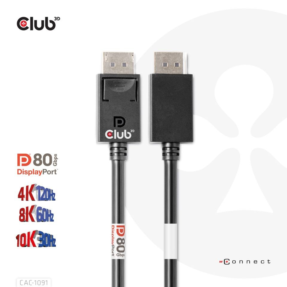 Kabel Club 3D CAC-1091 DisplayPort™ 2.1 umožňuje připojení vašeho (herního) PC nebo notebooku s podporou DisplayPort™ k (Ultra) monitoru s vysokým rozlišením nebo jinému zařízení s podporou DisplayPort™. DisplayPort™ 2.1 UHBR10/13.5/20 až 80 Gb/s, má také podporu pro Display Stream Compression 1.2 (DSC), Forward Error Correction a rozšiřuje maximální počet vložených audio kanálů na 32. Disponuje uzamykatelnými konektory DisplayPort™ zajišťujícími bezpečný , spolehlivé spojení, s NOVÝMI kontaktními prsty speciálně navrženými pro tyto vysoké rychlosti. Jednoduše stiskněte vestavěné jednodotykové tlačítko pro odemknutí konektoru. Měkký plášť UltraFlex chrání kabel před ohybem a poškozením deformací.