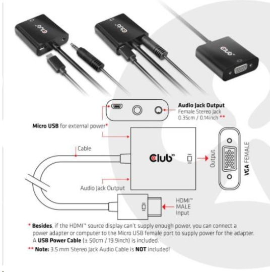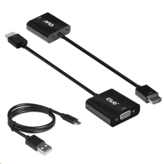The Club 3D CAC-1302 is an active HDMI™ 1.4 to VGA signal converter. It allows you to convert digital HDMI™ signal into analog VGA signal and extracts audio signal from HDMI™ signal through the R/L audio port.