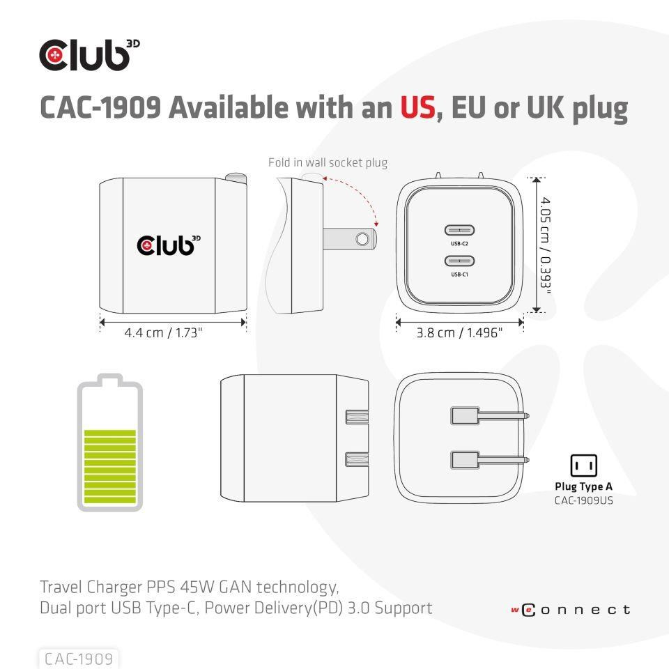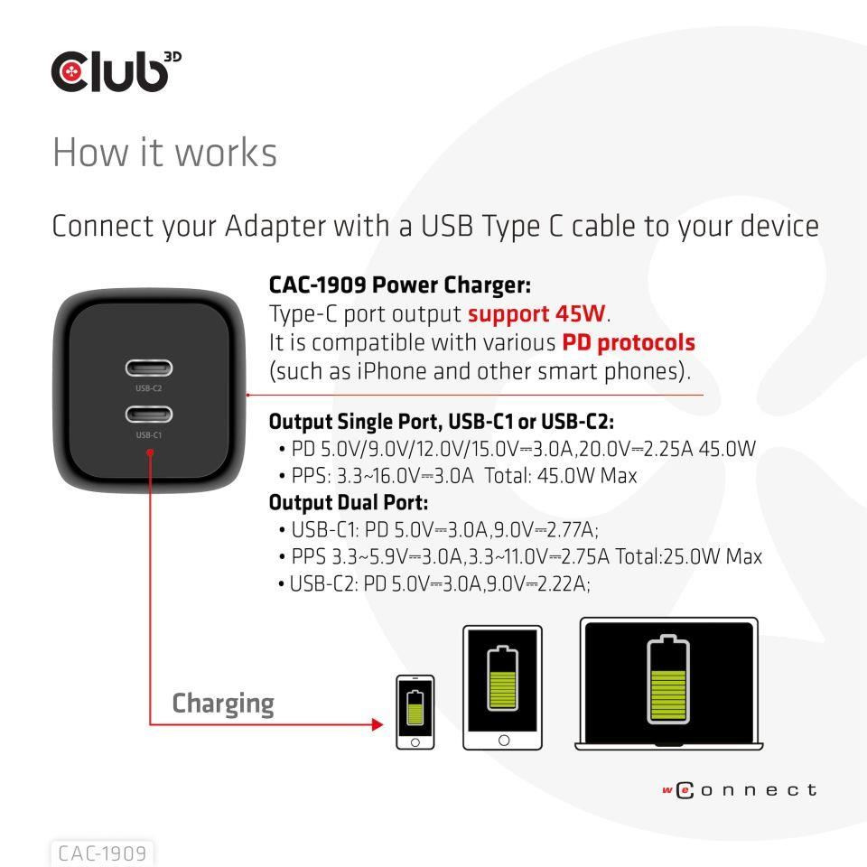 The Club3D CAC-1909 Travel Charger PPS 45W GAN technology, Dual port USB Type-C, Power Delivery(PD) 3.0 Support. Compact size & Superior Performance: GAN technology chipset makes this charger 50% smaller than traditional 45W charger, small enough to carry anywhere. The Programmable Power Supply(PPS) 45W wall charger match a variety of PD devices from smart phones to laptops, one for all making charging simple. This wide compatibility charger will be your convenient companion during your business trip or vacation. The Power Charger is light weight without compromising on Quality and safety. By adopting Power Delivery(PD) charging technology, this versatile Power Charger provides you with charging function through Dual USB Type-C interface, you can charge any connected Mobilephone / Tablet / NoteBook. Furthermore all it needs is a free USB Type-C port on your Dock/NoteBook/Tablet/ Mobile phone to be charged via the bundled USB cable.