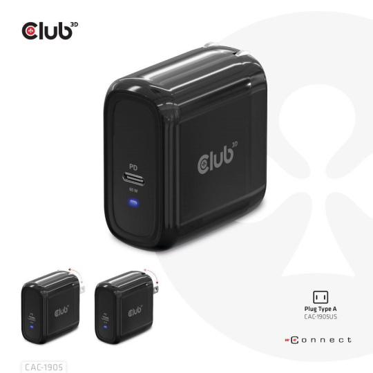 Club3D cestovní nabíječka PPS 65W GAN technologie, USB Type-C, Power Delivery(PD) 3.0 Support