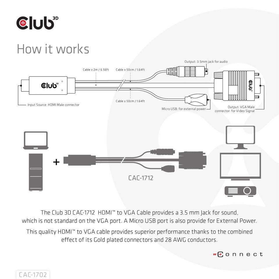The Club 3D CAC-1712 HDMI™ to VGA Cable M/M 2m/6.56ft 28AWG links any HDMI™-equipped desktop, laptop or adapter to a monitor, display, beamer or projector with a 15-pin VGA Female port. Ideal for at home or work, the cable creates a reliable connection for anything from gaming to video projection and supports up to Full HD 1080p(max. resolution of 1920 x 1080).