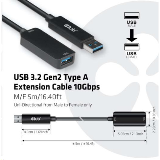 The Club 3D CAC-1411 is an USB Type A extension cable for extending and enhancing USB Signal up to 5m / 16.4 ft. It is compatible with USB 3.2 Gen 2 with a maximum of 10Gbps data transmission. Its downward compatible with lower versions, please note that specifications will be limited to the device connected.