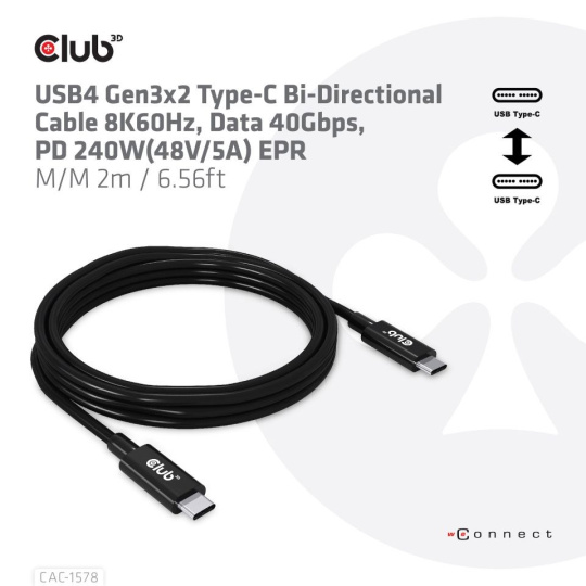 Club 3D CAC-1578 USB4 Gen3x2 Type-C obousměrný kabel 8K60Hz, Data 40Gbps, PD 240W(48V/5A) EPR M/M 2m / 6,56ft připojí váš notebook, tablet nebo telefon s výstupem USB4 Type-C k vašemu oblíbené stávající periferie, příslušenství a nabíječky. Umožňuje video, data a napájení přes jediný kabel a oběma způsoby. Tento kabel podporuje USB4 Gen3x2 Type-C obousměrné video 8K60Hz, Data 40Gbps, PD 240W(48V/5A) EPR M/M 2m / 6,56ft výstup pro downstream nabíjení nebo napájení vašeho notebooku, tabletu nebo smartphonu.