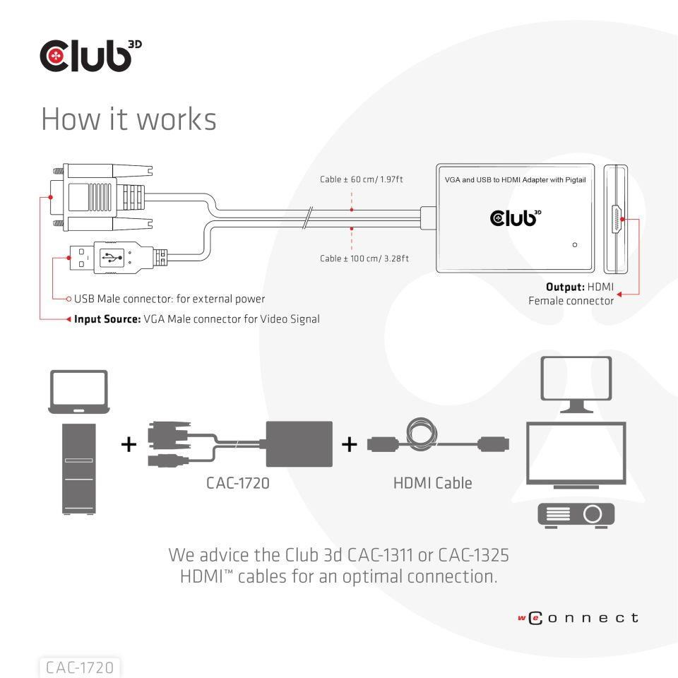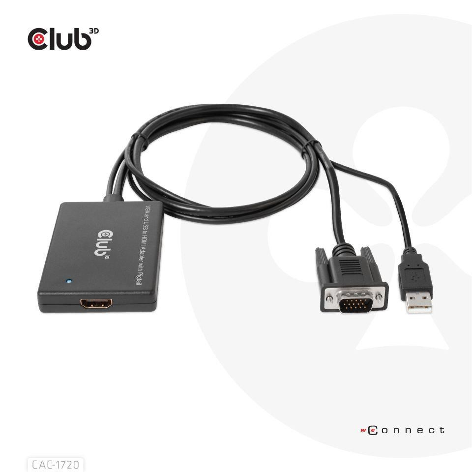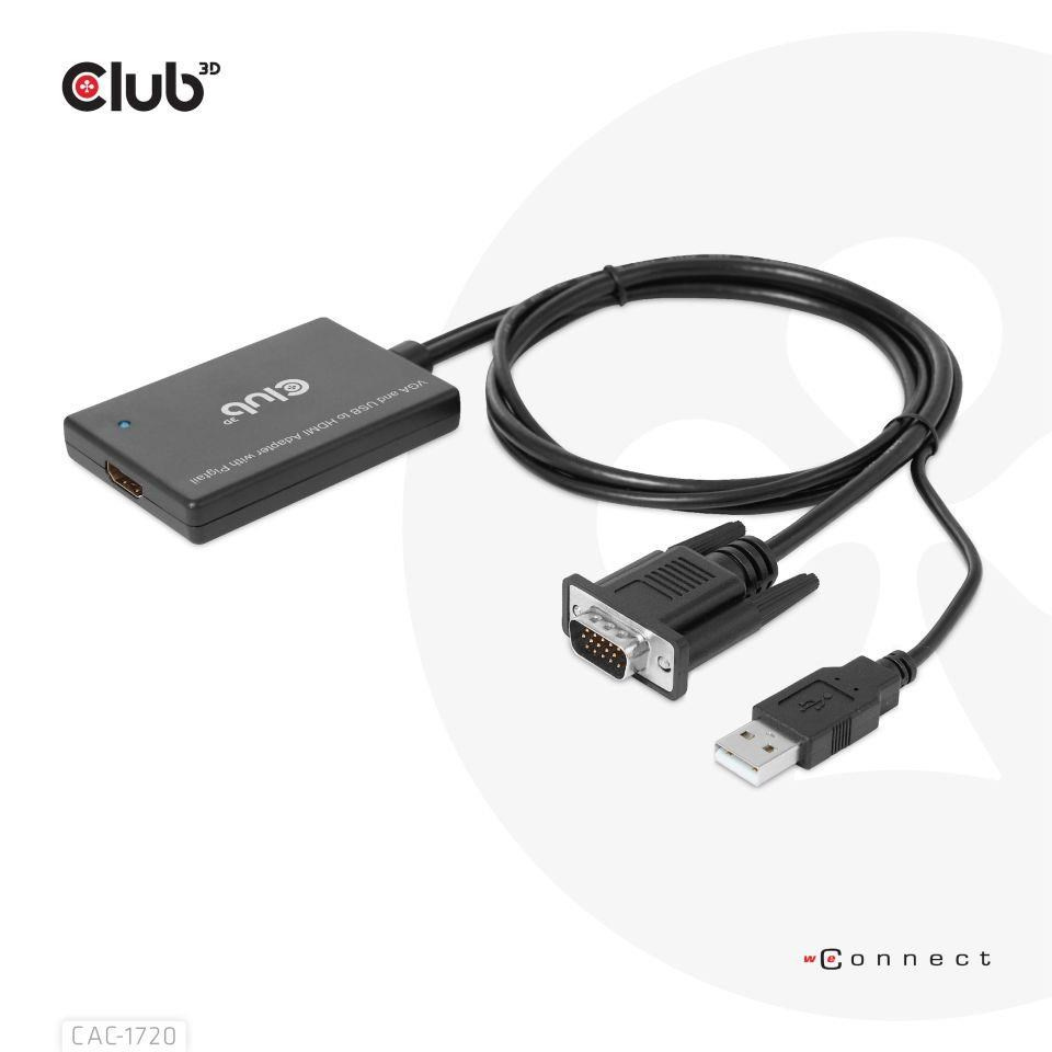 The Club 3D CAC-1720 VGA and USB Type-A to HDMI™ Adapter with Pigtail M/F 0.6m/1.97ft 28AWG links any VGA-equipped desktop, laptop or adapter to a monitor, display, beamer or projector with a HDMI™ Male port. Ideal for at home or work, the adapter creates a reliable connection for anything from gaming to video projection and supports up to Full HD 1080p(max. resolution of 1920 x 1080). An USB Type-A port is also provide for External Power. This quality VGA to HDMI™ cable provides superior performance thanks to the combined effect of its Gold plated connectors and 28 AWG conductors. Internal shielding provides reduced crosstalk, suppresses noise, and helps prevent electromagnetic interference (EMI) and radio frequency interference (RFI).