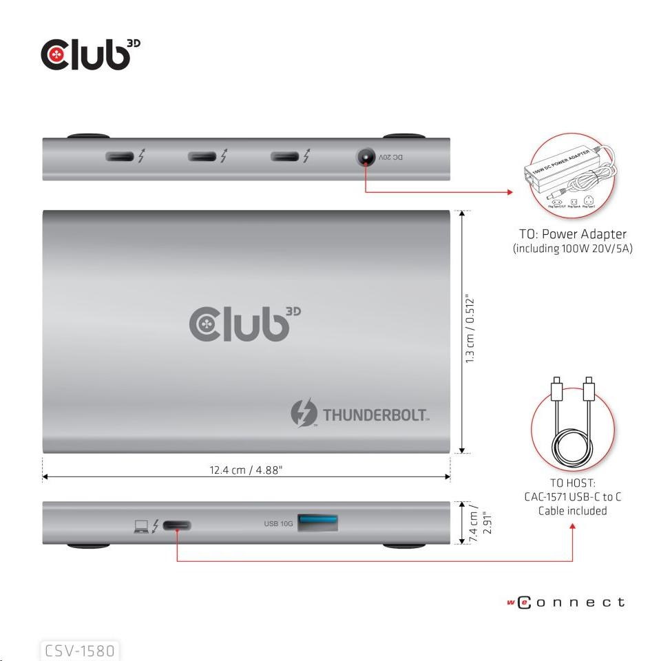 The Club 3D CSV-1580 is a Certified Thunderbolt™ 4 portable Hub which provides the most advanced, efficient, and versatile I/O solution available with up to 40Gb/s for data and video. For the first time this Thunderbolt™ 4 modern Hub has 3 Thunderbolt™ 4 downstream ports that allow you to cascade Thunderbolt™ 4 devices to one 8K30Hz or two 4K60Hz monitors, it can also easily connect to any USB Type-C device, all while simultaneously charging the PC. Besides, it supports Smart Power function which enables to distribute power according to the power consumption of the connected device, making full use of external power supply. It is designed for Thunderbolt™ 4 based PCs and Thunderbolt™ 3 based Macs™ utilizing MacOS™ 11 and later versions.