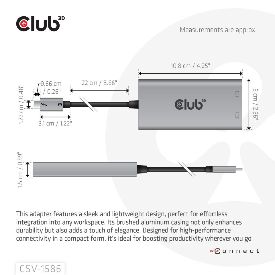 Adaptér Club 3D CSV-1586 Thunderbolt™ 3 na Dual DisplayPort™ 4K60Hz umožňuje uživatelům snadno připojit dvě obrazovky Displayport™ @ 4K60Hz k jakémukoli zařízení s rozhraním Thunderbolt™ 3. Podporované výstupní rozlišení je až duální 4K60Hz nebo 8K60Hz/4K120Hz. jediný displej. Je plně Plug & Play, takže není potřeba instalovat ovladače. Tento stylový adaptér má krásný kryt z broušeného hliníku, díky kterému je pevný a lehký.