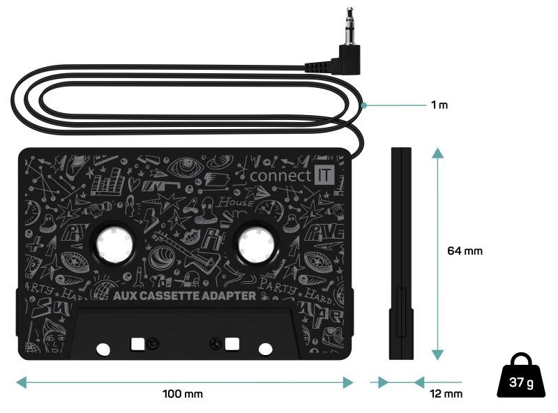 - Díky AUX kazetovému adaptéru budete moci poslouchat hudbu z vašeho oblíbeného digitálního zařízení, jako je např. mobilní telefon, MP3 přehrávač či další multimediální zařízení. Stačí jej vložit do přehrávače a pomocí kabelu propojit se zařízením s výstupem 3.5 mm jack.