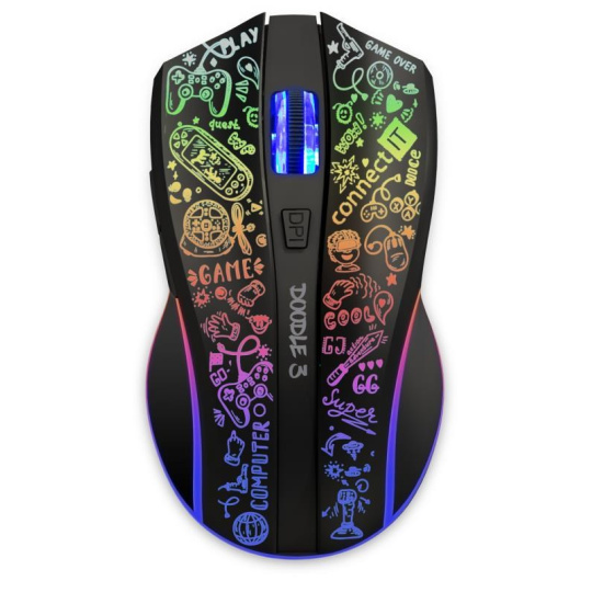 Profesionální bezdrátová gamingová myš DOODLE 3 pro hráče počítačových her s Rainbow podsvícením. Dodávaný SW s četnými nastaveními podporuje uživatelská makra, 5 uživatelských profilů a 6 programovatelných tlačítek včetně posuvného kolečka. Precizní optický senzor má nastavitelnou citlivost až na 4800 DPI. Myš využívá technologie jako povrchový RubberGrip pro eliminaci klouzavosti dlaně, UltraSlides Black pojezdy pro maximální možnou rychlost na podložce. Nechybí ani technologie AutoPowerSave šetřící kapacitu baterie. Software je zdarma ke stažení na stránkách www.connectit-europe.com. Samožřejmostí je pozlacený USB Nano přijímač a dodávaný nabíjecí kabel.