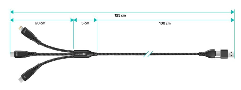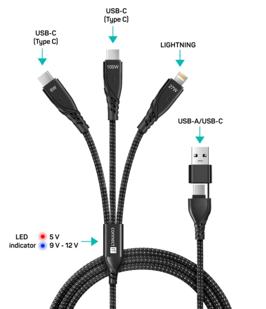 CONNECT IT Nabíjecí kabel Wirez 6v1, USB-C/USB, Lightning + 2x USB-C, 1.25m, černá