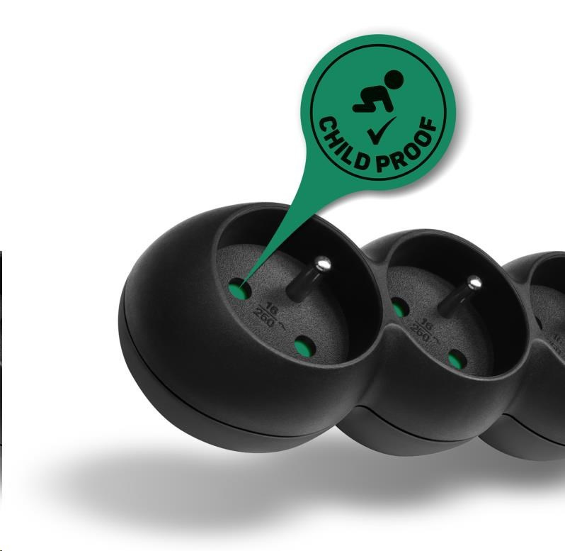 Prodlužovací kabelový přívod na 230V je vybaven hlavním síťovým vypínačem, který při vypnutí zcela odpojí od přívodu elektrické energie všechny zapojené spotřebiče najednou. Extra výbavou je dětská ochrana všech zásuvek – zásuvky jsou přístupné pouze v případě zasunutí obou vidlic najednou, nelze tedy zasunout jednotlivě např. pouze šroubovák nebo pletací jehlici. Díky pootočení zásuvek o 45° je možné používat i objemnější napájecí adaptéry nebo úhlové koncovky. Výsuvné očko v horní části zásuvkového modulu umožňuje zavěšení nebo pevnou instalaci na stěnu (s výhodou využijete např. v dílnách a garážích). Výrobek byl testován a certifikován v evropském testovacím centru a splňuje nejpřísnější bezpečnostní požadavky a nejnovější normy, takže umožňuje zapojení spotřebičů o celkovém příkonu až 2500 W.