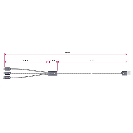 Univerzální nabíjecí kabel 3v1 na nabíjení zařízení s konektory Micro USB, Lightning a USB-C (Type C) umožňuje nabíjení až tří zařízení současně s podporou rychlého nabíjení pomocí max. proudového toku 2 A
