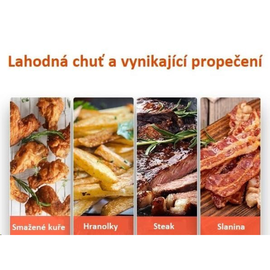 Horký vzduch rotuje kolem jídla ze všech stran a tím dosahuje kvalitního a rovnoměrného propečení a uvaření pokrmů. Díky této technologii se fritéza předehřeje během pouhých 5 minut.