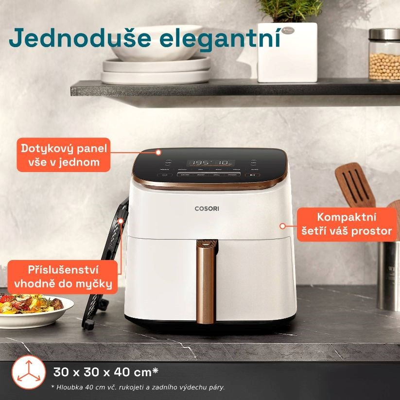 I přes svou vysokou kapacitu si Cosori TurboBlaze zachoval kompaktní rozměry a snadno se vejde do každé kuchyně.