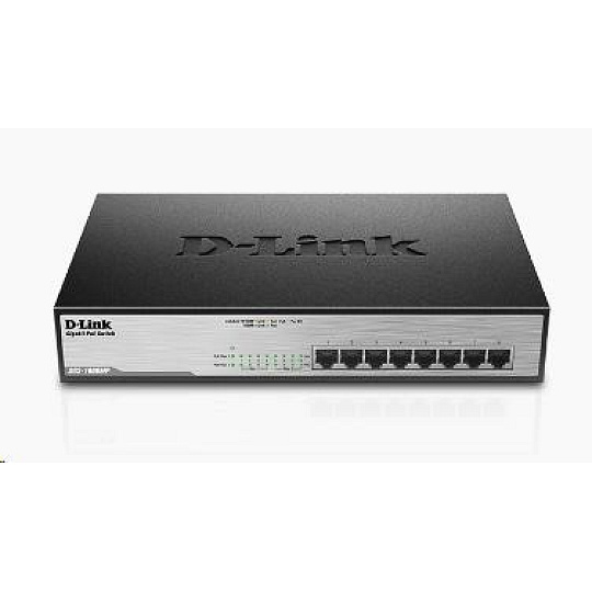 8-Port Desktop Gigabit PoE+ Switch - 8-Port 10/100/1000 Gigabit Ethernet Ports - 8 x PoE Ports - PoE output up to 30 watts per port - IEEE 802.3x flow control - Auto Half-/Full-Duplex Mode - Max power budget 140 watts - Auto MDI/MDI-X crossover for all ports - 11-inch Desktop/Rackmount Size, 1U height - Rack Mountable - D-Link Green Technology - Store-and-forward switching scheme - RoHS compliant.