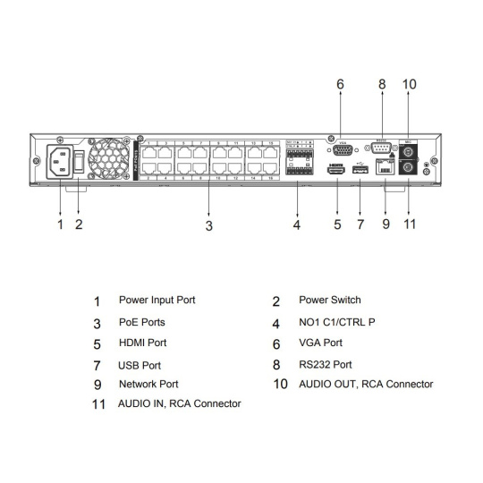 - 1× 10/100/1000 Mbps RJ-45, 16× 10/100 Mbps RJ-45 PoE (IEEE 802.3 af/at), 2× USB 2.0, pozice pro 2× SATA HDD (max. 20 TB/disk), 1× HDMI, 1× VGA, 1× RS-232