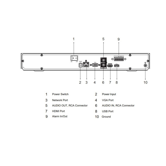 1× 10/100/1000 MbE RJ-45, 1× audio vstup (RCA), 1× audio výstup (RCA), 4× alarm vstup, 2× alarm výstup, 2× USB 2.0, pozice pro 2× SATA HDD (max. 20 TB/disk), 1× HDMI, 1× VGA.