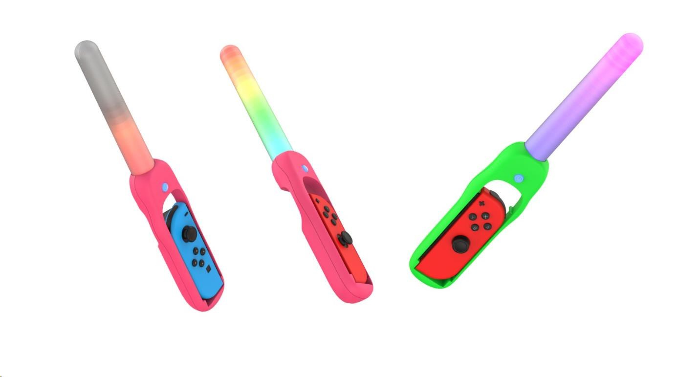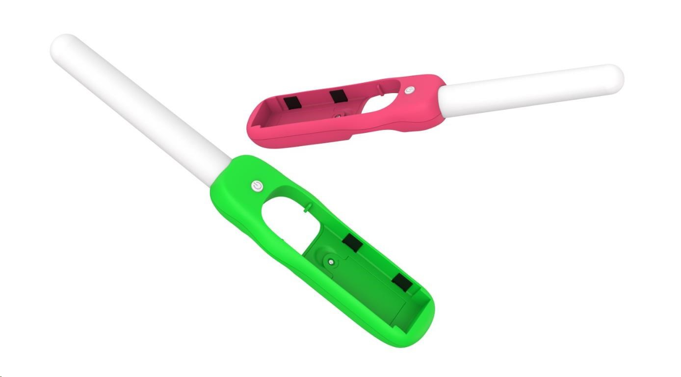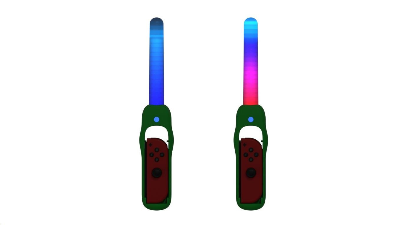 Dance ‘N’ Play Kit obsahuje 2x svíticí tyčinky LED citlivé na zvuk, s růžovým a zeleným úchytem a zápěstními řemínky. Svíticí tyčinky LED citlivé na zvuk s vícebarevným efektem duhového podsvícení budou fungovat, pulzovat, zářit a tančit podle jakéhokoliv zvuku. Ať už půjde o hudbu, nebo zvuky ze hry, Dance ‘N’ Play Kit prozáří váš pokoj.