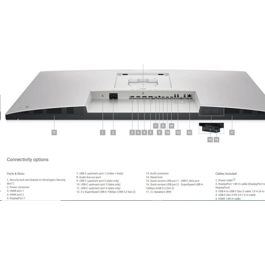 1. Security lock slot (based on Kensington Security Slot™) 2. Power connector 3. HDMI port 1 4. HDMI port 2 5. DisplayPort 1 6. DisplayPort 2 7. USB-C upstream port 1 (Video + Data) 8. Audio line-out port 9. USB-C upstream port 2 (data only) 10. USB-C upstream port 3 (data only) 11. USB-C upstream port 4 (data only) 12. 3 x SuperSpeed USB-A 10Gbps (USB 3.2 Gen 2) 13. RJ45 connector 14. Stand lock 15. Quick access USB port 1 - USB-C data port 16. Quick access USB port 2 - SuperSpeed USB-A 10Gbps (USB 3.2 Gen 2) 17. 2 x Speakers (8W) |