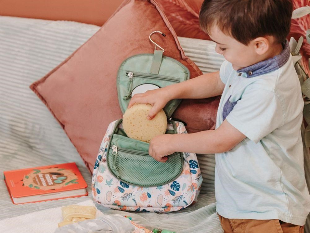 Kosmetická taška na zavěšení, v neutrální zelené barvě, s roztomilým lenochodem, je originální dětskou toaletní taškou na cesty. Velice pevná a odolná kosmetická taška, se spoustou kapsiček a odnímatelným zrcátkem, v pohodě pojme hygienické potřeby vaší holčičky nebo chlapce. Vodoodpudivý materiál umožní dětem používat tašku v koupelně i ve sprše. Díky háčku tašku jednoduše zavěsíte na háček nebo vodovodní baterii a děti mají své toaletní potřeby pohodlně po ruce..