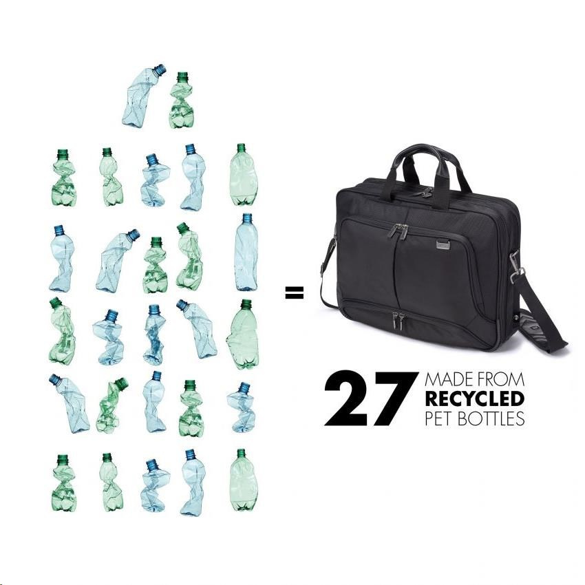 Travel "1st class" with the Eco Top Traveller PRO. The toploader bag reliably accompanies you everywhere and meets the highest standards of quality, functionality and protection: DICOTA's attention to detail makes this bag one of your most reliable business partners! The fitall system separating wall in the notebook compartment lies protectively across your notebook and fits automatically to sizes from 15-17.3". The perforated and thus light EVA foam material in the lockable notebook compartment perfectly protects the edges of your device. The anti slip technology coating ensures perfect grip for your notebook in the compartment. Excellent protection for your tablet up to 12.9" thanks to the EVA-shaped compartment with extra-soft Nylex inner lining. Generous storage space for documents. The front pocket with keychain and insert pockets allows to organise the personal equipment and provides space for additional mobile accessories. Additional pocket for charger and cables. The bag is light and comfortable in your hand thanks to the high-quality genuine leather handles. Trolley strap can also be used as an additional document compartment. Bag bottom is made from waterproof material. The Eco Top Traveller PRO is therefore perfect for you if you are always on the go and want to support the recycling of PET bottles with an eco-friendly case.