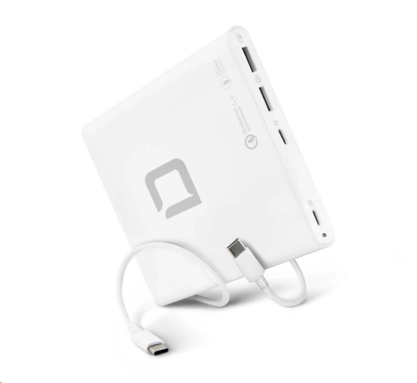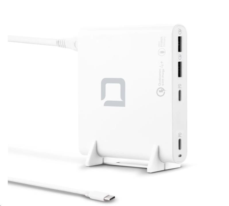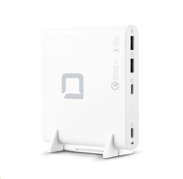 Nabíječku lze používat ve více než 180 zemích a je vybavena dvěma výstupy USB-C s technologií Power Delivery 3.0 a dvěma porty USB-A s technologií Qualcomm Quick Charge 4.0+. Maximální výkon nabíjecí stanice je 120 W. Výstupní napětí (5 - 20 V) a nabíjecí proud (až 5 A) se automaticky přizpůsobují připojeným zařízením. Inteligentní řídicí systém šetří baterii a zároveň nabízí spolehlivou ochranu proti nadproudu, přepětí, zkratu a přehřátí. Elegantní design, kompaktní tvar a hmotnost pouhých 240 gramů - ideální společník pro rychlé a efektivní získávání energie doma, v kanceláři nebo na cestách. Součástí je plastový stojánek, který zabraňuje přehřátí.