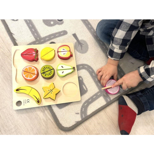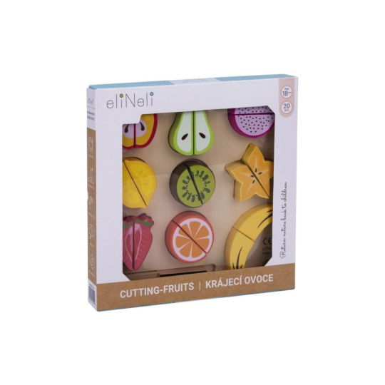 Dřevěné ovoce ke krájení je hračkou, která by neměla chybět v žádné dětské kuchyňce ani dětském obchůdku. Toto krájení je pro děti zcela bezpečné. Půlky ovoce jsou spolu spojený suchým zipem, díky kterému děti ovoce dřevěným nožem jednoduše rozkrojí. Balení obsahuje 9 druhů ovoce, dřevěné prkénko i dřevěný nůž..