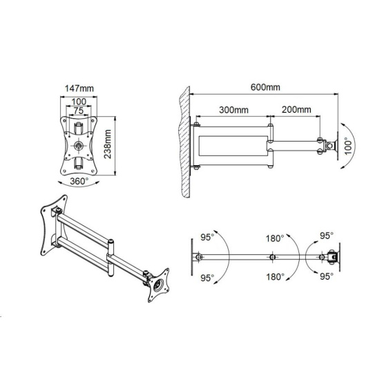 Profesionální držák na Tv monitory 15-43", VESA standard 75x75 a 100x100, otočný +/-90°, sklopný +10°/-50°, nastavení vzdálenosti od zdi 9-60cm, rotace pivot, profesionální držák, nosnost 15kg.... více