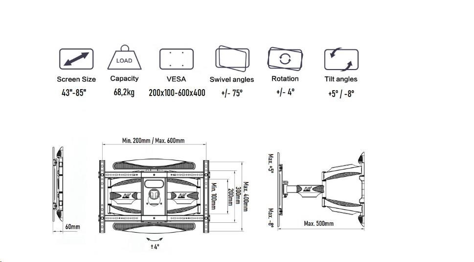 Profesionální držák Tv 43" - 85", otáčení do stran až +/- 75°, naklápění +5° / -8°, vzdálenost od zdi 60 - 500mm, VESA standardy 200x100 až 600x400, korekce roviny +/- 4°, systém vedení kabeláže, nosnost 68,2 kg.... více