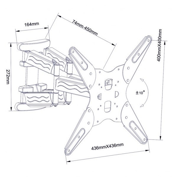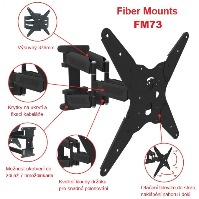 Dvouramenný otočný držák na Tv Fiber Mounts FM73 Kvalitní polohovatelný držák na televize 30-60", dvouramenný. nosnost 35kg Nástěnný držák pro spolehlivé a bezpečné zavěšení televize na zeď a její úpravu polohy. Držák je ideální na Tv 30-60", podporuje VESA 75x75 až 400x400 a můžete na něj zavěsit televizi s hmotností až 35kg. Držák umožňuje televizi vysunovat od zdi, otáčet do stran a naklápět nahoru i dolů. Konstrukce je ocelová a je opatřena dizajnovými krytkami, pod kterými snadno ukryjete a zafixujete veškerou kabeláž. Barevné provedení černé, záruka 5 let. Nástěnný dvojramenný držák pro otáčení a naklápění televize Fiber Mounts FM73 Technické údaje: nosnost 35kg podporuje VESA 75x75 až 400x400 vhodný na televize s úhlopříčkou 30" až 60" minimální vzdálenost televize od zdi 74mm maximální vzdálenost televize od zdi 450mm otáčení televize na obě strany +/- 45° naklápění televize nahoru nebo dolů o +/- 10° dizajnové krytky konstrukce se systémem pro ukrytí kabeláže vynikající kvalita, ocelová konstrukce balení obsahuje instalační materiál barevné provedení černé záruka 5 let Držák pro zavěšení televize na zeď s kvalitní dvojramennou konstrukcí Fiber Mounts FM73 Nástěnný dvouramenný držák Tv Fiber Mounts FM73 podporuje VESA standardy: VESA 75x75 VESA 100x100 VESA 100x200 VESA 200x100 VESA 200x200 VESA 300x300 VESA 400x400 Držák Fiber Mounts FM73 je vhodný pro zavěšení každé televize, která podporuje kterýkoliv z výše uvedených VESA standardů a její hmotnost není vyšší jak 35kg. Na úhlopříčce televize nezáleží, televize může mít i výrazně více jak 60"..