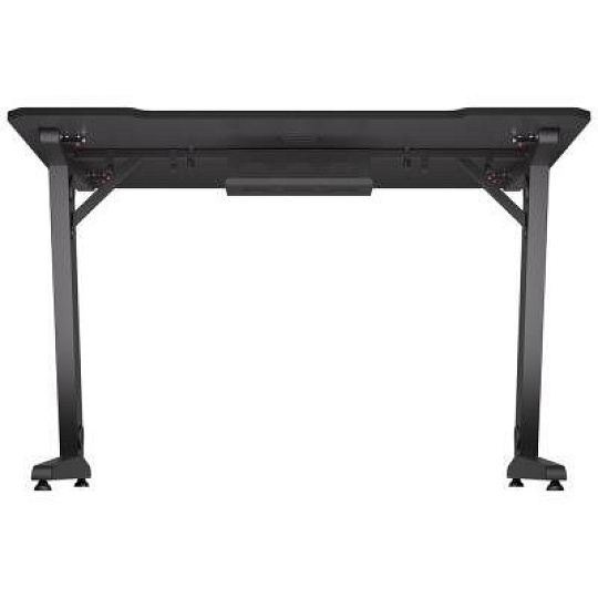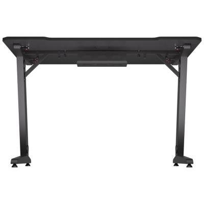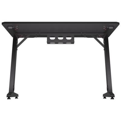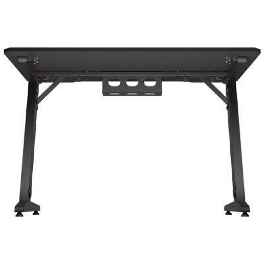 Herní stůl o délce 114 cm a šířce 74 cm nabízí dostatek prostoru pro myš, klávesnici a další příslušenství. Na spodní straně desky je umístěn systém pro správu kabelů, které lze následně vést průchodkami v nohách stolu. Maximální stabilitu zajišťuje robustní ocelová konstrukce s nosností až 80 kg. Povrchová úprava desky stolu ve stylu uhlíkových vláken nejen dobře vypadá, ale je také odolná proti poškrábání. V neposlední řadě zajisté potěší kovová polička pro napájecí lištu umístěná na zadní straně.