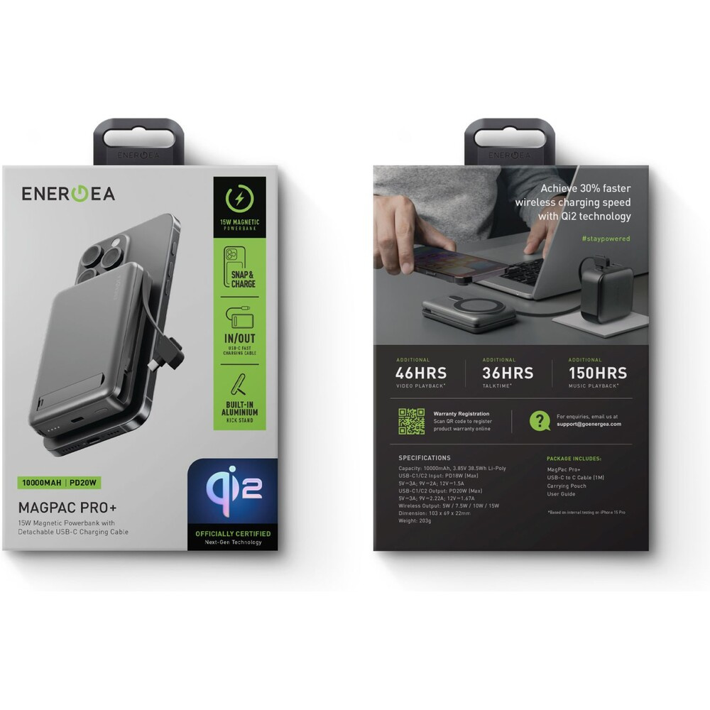 ENERGEA MagPac Pro Plus (Qi2) MagSafe powerbanka s kabelem, 10000mAh, černá