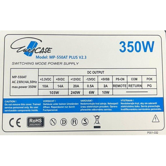 Napájecí zdroj ATX značky Eurocase s výkonem 350W. Je osazen 120mm ventilátorem a pasivním PFC (Power factor correction). Otáčky ventilátoru jsou řízeny termoregulací. Zdroj splňuje požadavky na elektrickou bezpečnost a elektromagnetickou kompatibilitu. Zdroj vyhovuje i směrnici 2005/32/EU = příkon v pohotovostním režimu.