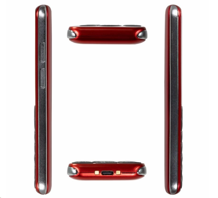 Barevný displej 2,8", 4G síť, SOS tlačítko s GPS lokalizací polohy, 2000 kontaktů, Dual Nano SIM, fotoaparát s bleskem, FM rádio s vestavěnou anténou, fotokontakty, Bluetooth, microSDHC, výkonná svítilna, nabíjecí kolébka, USB-C, Li-Ion baterie 1200 mAh