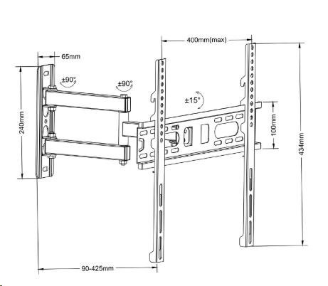 Technické údaje: nosnost 30kg podporuje VESA standardy 100x100 až 400x400 na všechny typy televizorů s úhlopříčkou 26-55" otáčení na obě strany +/- 90° náklon obrazovky nahoru nebo dolů +/- 15° nastavení vzdálenosti od zdi v rozmezí 90-425mm zajištění obrazovky proti vysazení kvalitní ocelová konstrukce ukotvení do zdi na 3 hmoždinky instalační materiál součástí balení barevné provedení černé výborná kvalita záruka 3 roky Kloubový držák na Tv FM761 podporuje VESA standardy: VESA 100x100 VESA 200x100 a 100x200 VESA 200x200 VESA 300x200 a 200x300 VESA 300x300 VESA 400x200 a 200x400 VESA 400x300 a 300x400 VESA 400x400 Držák nepodporuje VESA standard 75x75, který bývá u nejmenších televizorů a monitorů. Nástěnný držák FM761 je vhodný pro zavěšení všech typů televizorů a monitorů, které podporují některý z výše uvedených VESA standardů a jejichž hmotnost není vyšší jak 30kg. Zavěsit můžete jak klasické rovné tak i prohnuté televizory a monitory. Na úhlopříčce televizoru nebo monitoru nezáleží, pokud není překročena nosnost držáku a Vaše Tv podporuje některý z uvedených VESA standardů, můžete zavěsit i podstatně větší obrazovky..