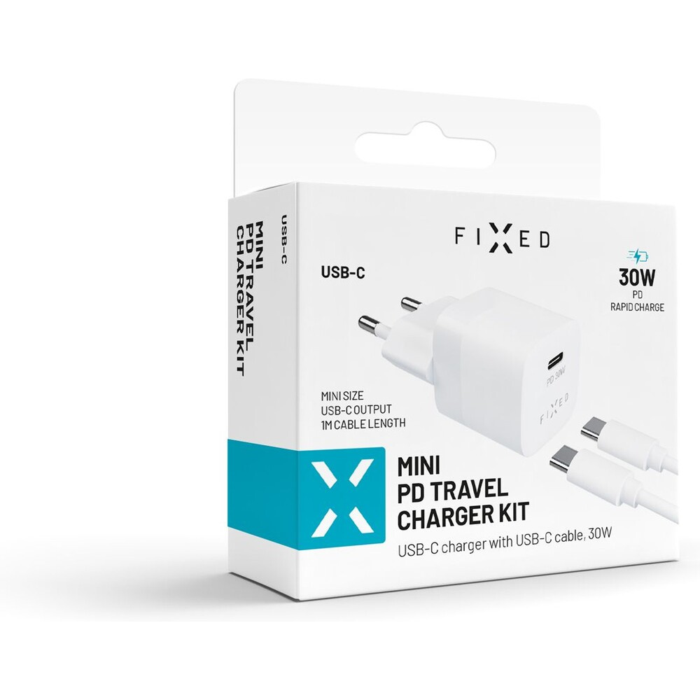 FIXED Mini nabíječka s USB-C/USB-C kabelem, PD, 1 m, 30W, bílá