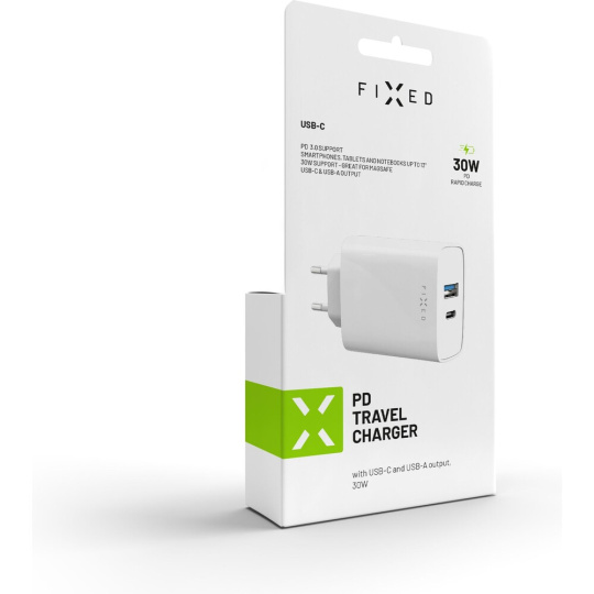 FIXED síťová nabíječka s USB-C/USB výstupem, PD, 30W, bílá