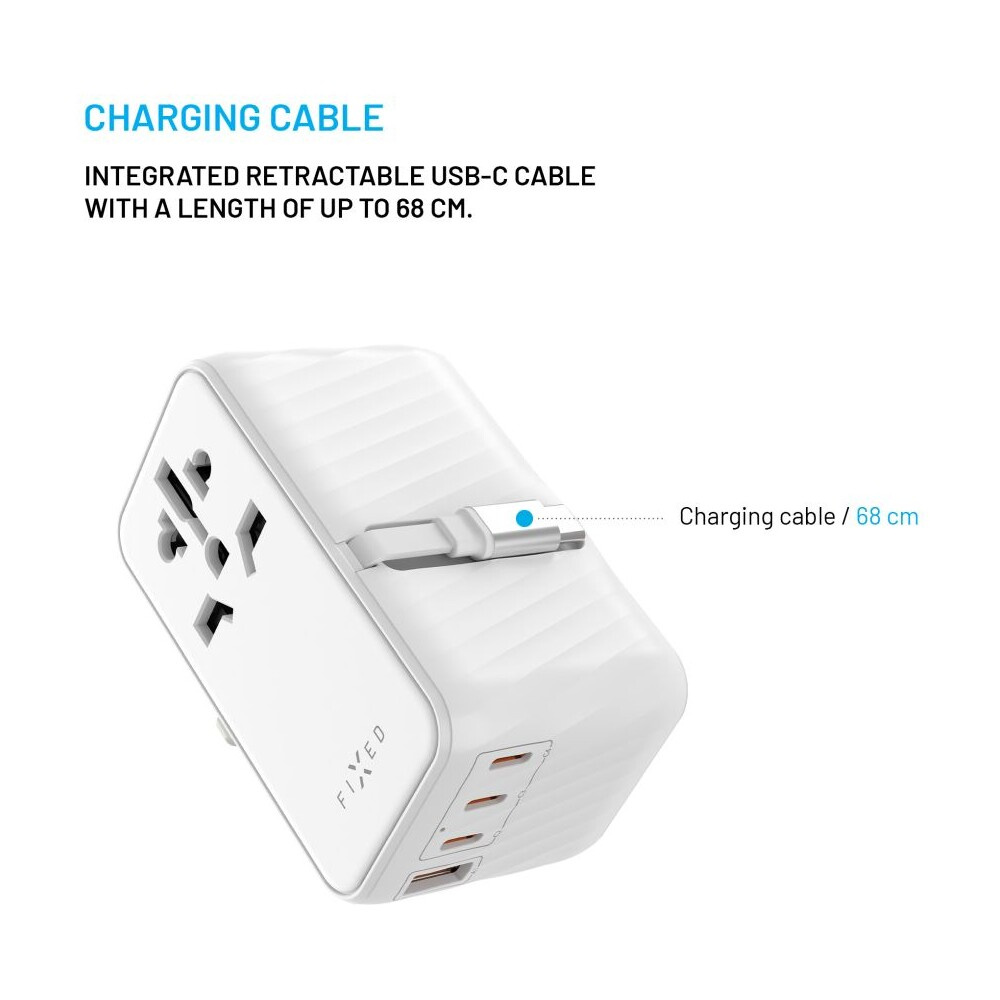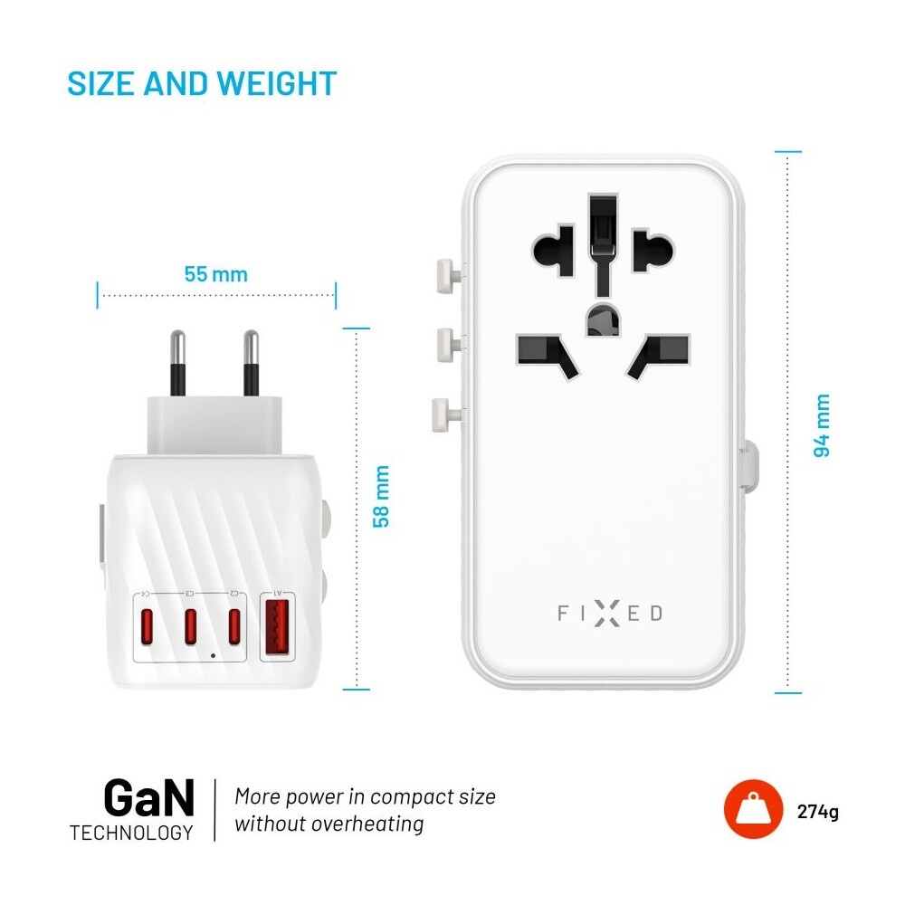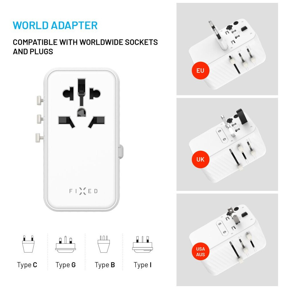 FIXED Voyager (85W) cestovní adaptér EU/UK/USA/AUS, 4xUSB-C a 1xUSB, GaN, PD, bílý