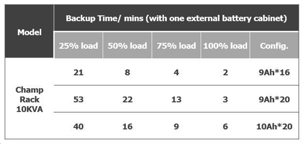| Backup time - 1x Battery Bank (20pcs 10Ah) | |