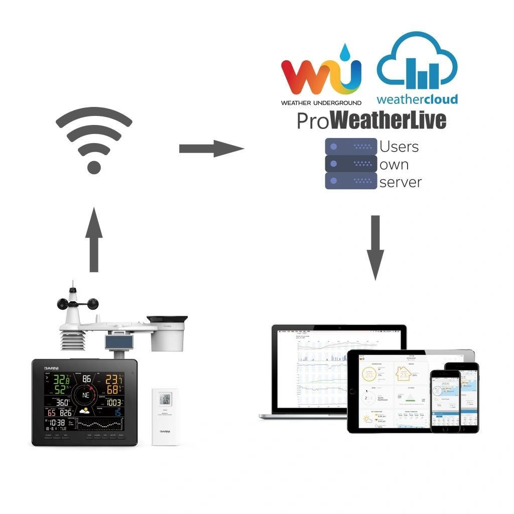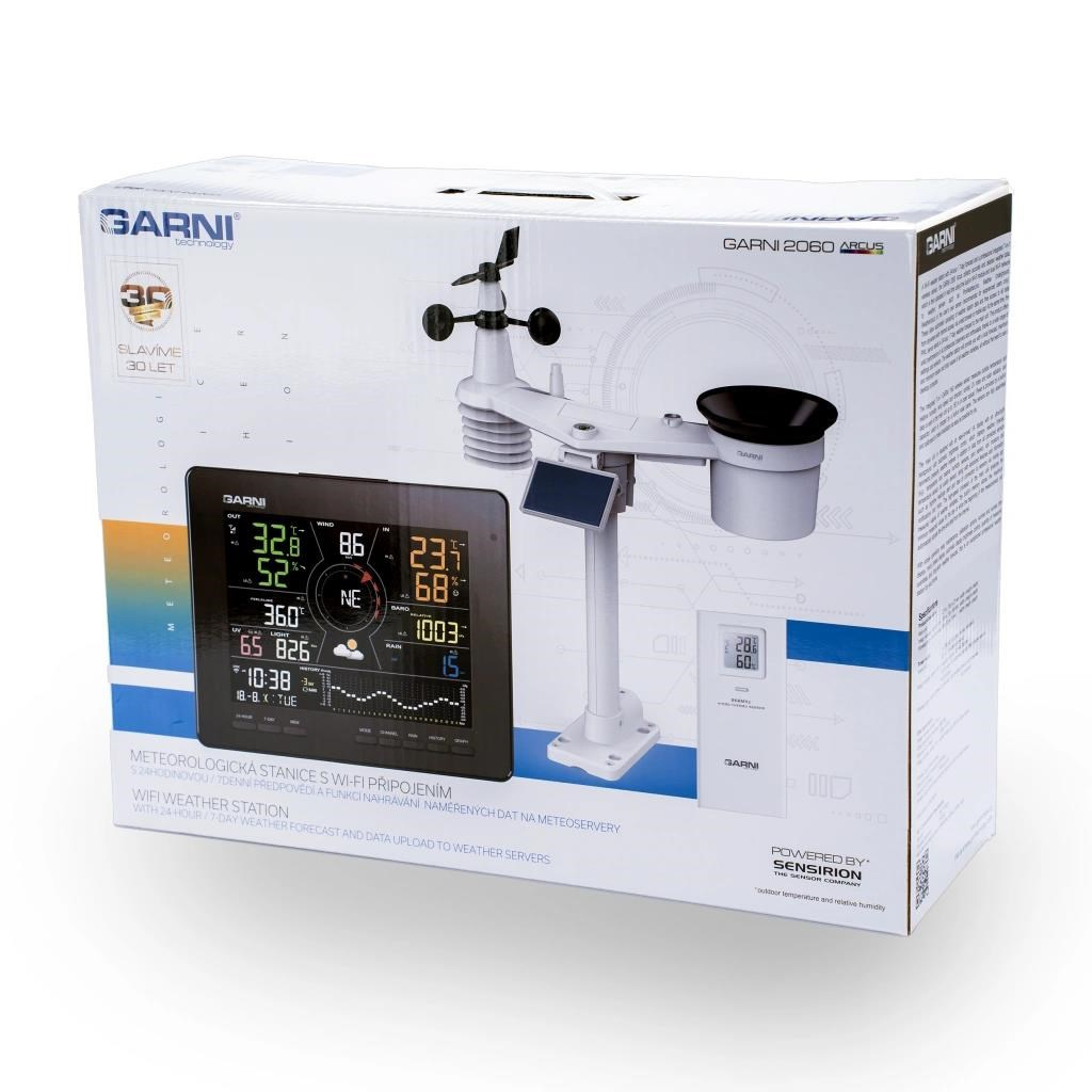 Meteorologická stanice s Wi-Fi, 24hodinovou / 7denní předpovědí a profesionálním integrovaným bezdrátovým čidlem 7-v-1 se solárním panelem a vestavěným kapacitorem, model GARNI 2060 Arcus, shromažďuje přesné a podrobné údaje o počasí, které jsou pak v reálném čase odesílány pomocí vestavěného Wi-Fi modulu a místní sítě Wi-Fi na meteorologické servery a aplikace, jako jsou ProWeatherLive, Weather Underground, Weathercloud, Počasí Meteo nebo vlastní server uživatele (doporučeno pouze pro zkušené uživatele). Ty umožňují automatizované nahrávání dat meteorologické stanice a volný přístup ke všem datům odkudkoli s přístupem na internet, přes webový prohlížeč nebo mobilní aplikaci. Zároveň ProWeatherLive (PWL) server posílá 24hodinovou / 7denní předpověď počasí do hlavní jednotky. Výrobek nabízí solidní výkon všem profesionálním pozorovatelům a nadšencům díky široké škále nastavení a čidel. Meteorologická stanice vám poskytne lokální předpověď, maximální a minimální hodnoty a celkové hodnoty všech meteorologických proměnných, to vše bez nutnosti použití stolního počítače.