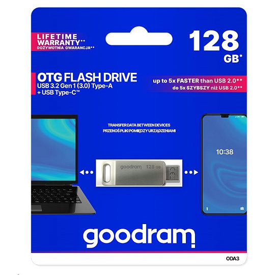 Type-C™ is becoming the most popular USB type used to transfer data between all electronic devices. The growing popularity of this solution is supported by the fact that manufacturers of next gen laptops, smartphones, PCs and other devices are increasingly equipping their products with an additional “C” next to the standard type A connector or choose only Type-C™. GOODRAM OTG ODA is an excellent solution that will work both with an old and new electronic devices generation laptops, smartphones and PCs. The ODA Flash drive is equipped with two fast USB 3.2 connectors: one standard type A and the Type-C™, which means that data transfer between devices of different generations has never been so easy and fast.