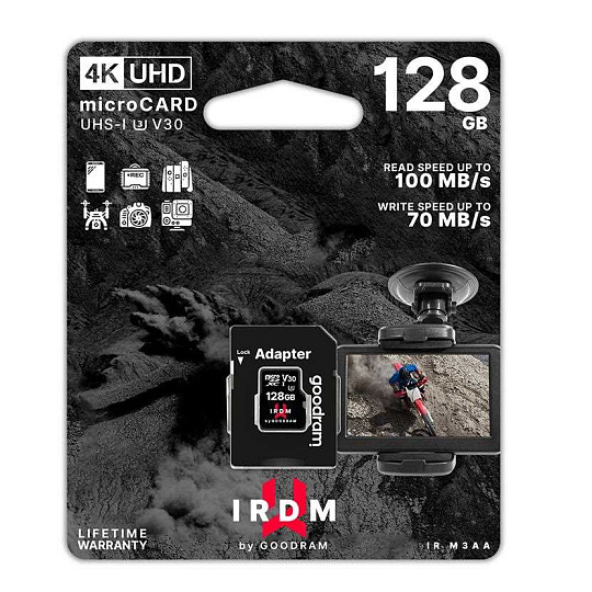 IRDM UHS-I U3 microCARD brings high performance and reliability for everyone who wants to shoot 4K and slow motion videos or shoot high quality JPEG/RAW pictures in fast burst modes.