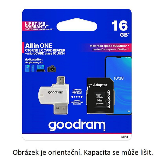 GOODRAM M1A4 All in One delivers versatility by providing functionality of few devices in one solution. It is a card reader equipped with USB 2.0 and micro USB connectors, allowing easy data transfer between computers, smartphones, tablets and cameras. It comes bundled with a fast UHS-I microCard.