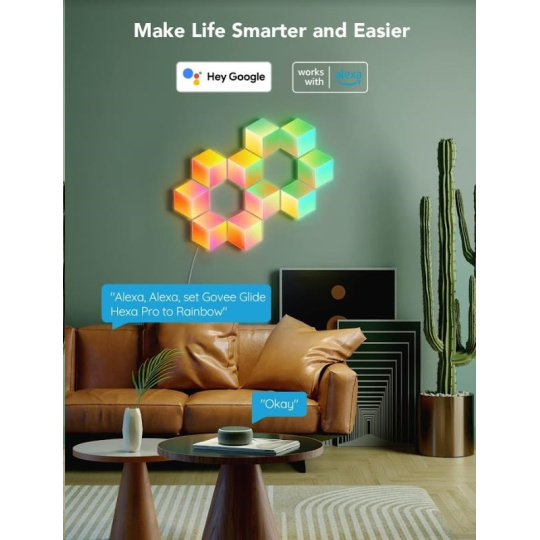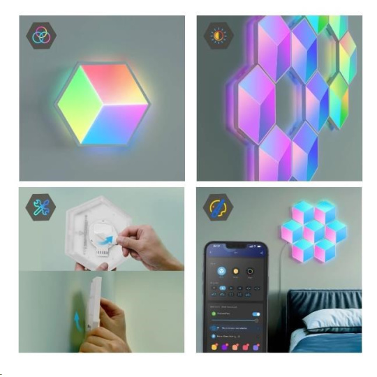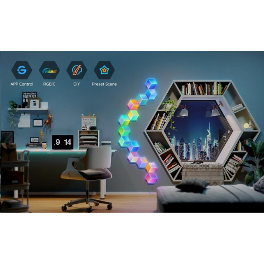 Govee Hexa Pro nabízí 38 různých režimů pro dokonalé naladění světelné atmosféry. Govee technologie RGBIC umí zobrazit až 57 barev najednou z celkové škály 16 milionů barev při intenzitě 1-100%. Může se také pochlubit životností až 50.000 hodin.