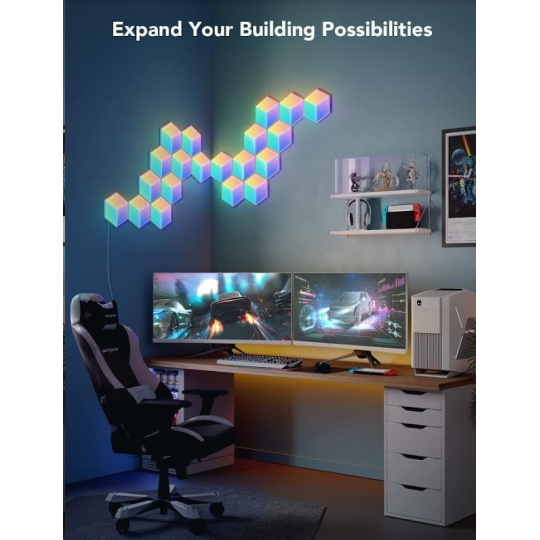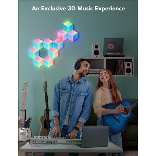 Vylepšete interiér a herní, filmové a hudební zážitky s designovým světlem Hexa PRO 3D Smart LED. Díky technologii RGBIC zobrazuje až 57 barev najednou. Barevnost si můžete nastavit po jednotlivých sekcích a kreativně si pohrát s 3D efektem osvětlení. Celkově umí zobrazit až 16 milionů barev s intenzitou 1-100%. Určitě si vyberete z mnoha režimů osvětlení a při poslouchaní oblíbené hudby si můžete zvolit také ze 6 rytmických režimů. Světla se ovládají hlasem přes Siri, Amazon Alexa nebo Google Assistant nebo přes aplikaci Govee Home na chytrém telefonu nebo tabletu. Světlo je určeno na instalaci na zeď a jeho tvar si můžete přizpůsobit podle vlastní fantazie. Jednoduchá instalace bez vrtání s životností až 50.000 hodin.