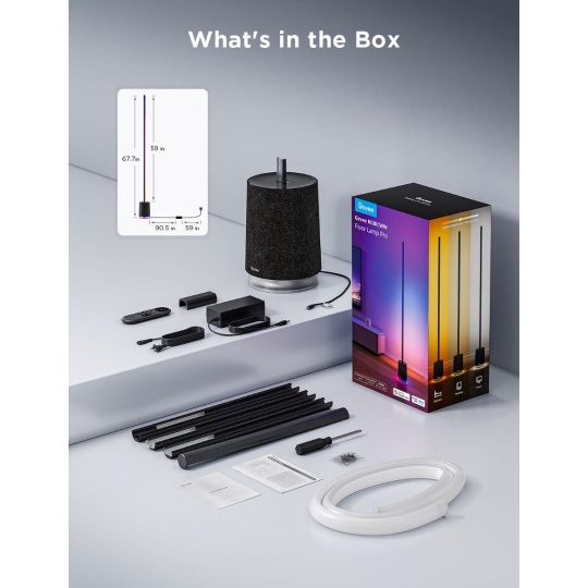 Govee Floor Lamp Pro vychází z modelu Lyra. Je to minimalistická, moderní podlahová lampa s BT reproduktorem, která poskytne dokonalou podívanou a perfektní zvukový zážitek. Lampa nabízí velmi slušných 2100 lumenů. Díky 324 diodám s technologií 4 v 1 RGBICWW, které lze rozdělit až na 54 nezávisle programovatelných segmentů dokáže lampa předvádět efektní podívanou jako perfektní barevné přechody, složité barevné vizualizace a skvělý jas a kontrast. dosahuje světlo ohromující intenzity. K dispozici je přes 16 milionů barev nebo bílá laditelná od 2200 do 6500 K. Floor Lamp Pro je také vybavena BT reproduktorem, takže k ní můžete připojit svůj telefon nebo TV a využít ji k přehrávání hudby nebo filmů. Dodatečně je lampa vybavena 29 presety bílého šumu, který vám pomůže se soustředěním, relaxací nebo usnutím. S funkcí DreamView můžete lampu synchronizovat s dalšími Govee světly a jedním stiskem tak tvořit atmosféru pro každou příležitost. Lampa měří 172 cm, ale zabírá minimální prostor a lze ji tak umístit doslova kamkoliv. Nejvíce jí to však sluší v rohu nebo u zdi, kde osvítí maximální prostor za sebou a vykouzlí na vaše zdi úžasně plynulé barevné přechody. Životnost lampy je u Govee standardních 25.000 hodin. Ovládání je možné aplikací Govee Home, Google Home, pomocí asistentů Google, Apple i Amazon. Pro maximální pohodlí v balení naleznete i klasický dálkový ovladač, který je kdykoliv v pohotovosti, připnutý přímo k lampě. Samozřejmostí jsou přednastavené scény, kterých je zde 81, několik režimů synchronizace s hudbou a pokud si ani tak nevyberete, čeká na vás DIY režim, který vám dá 100% kontrolu při které je jediný limit vaše fantazie.
