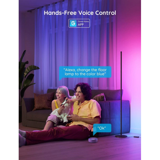 Lampička Govee Smart Corner Floor Lamp je kompatibilní s asistenty Alexa, Google Assistant a Siri. Nyní můžete Govee Smart Corner Floor Lamp zapnout/vypnout, upravit úrovně jasu nebo změnit jejich barvu pomocí hlasových příkazů z pohodlí své pohovky nebo postele. Ovládat lampu je možné také přímo na panelu nebo přes aplikaci ve vašem smartphonu nebo tabletu.